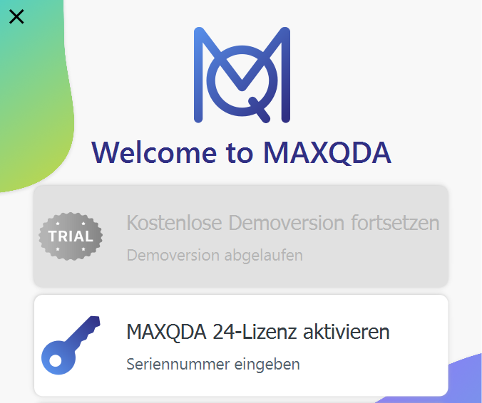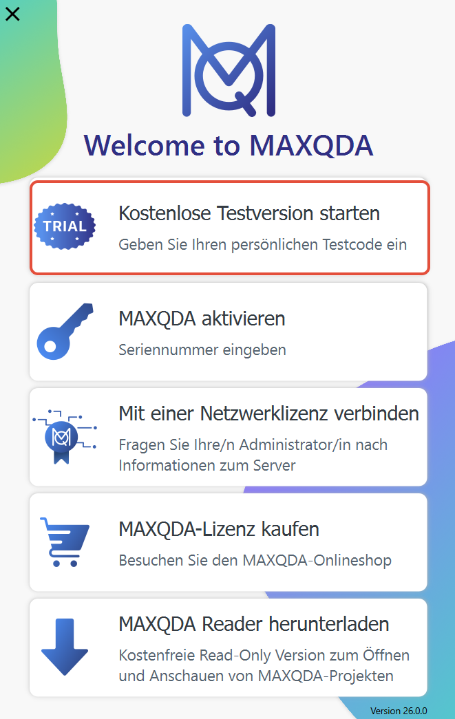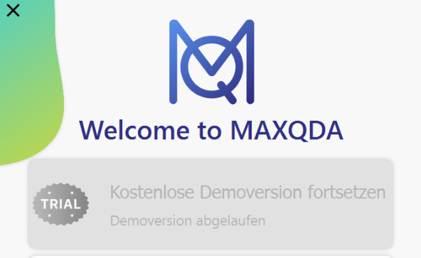 Sie erhalten daraufhin eine E-Mail mit Ihrem persönlichen Testcode. Diesen geben Sie in MAXQDA ein, indem Sie im Aktivierungsdialog einfach auf die oberste Schaltfläche kostenlose Testversion starten klicken.