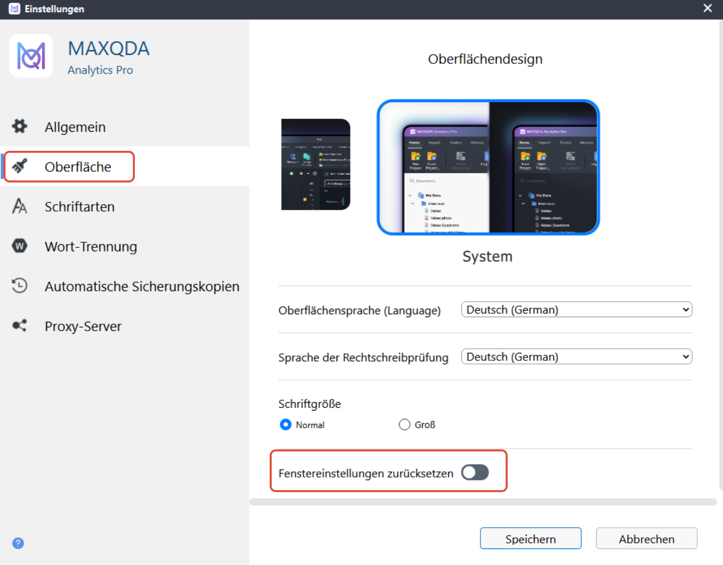 Sobald das Fenster geschlossen wird, startet MAXQDA neu und die Einstellungen werden zurückgesetzt.