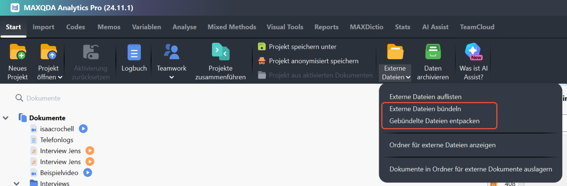 Die Dateien werden nun in den Ordner für externe Dateien kopiert und mit den Dokumenten in Ihrem Projekt verknüpft, so dass Sie die Dateien wieder aus MAXQDA heraus öffnen können.