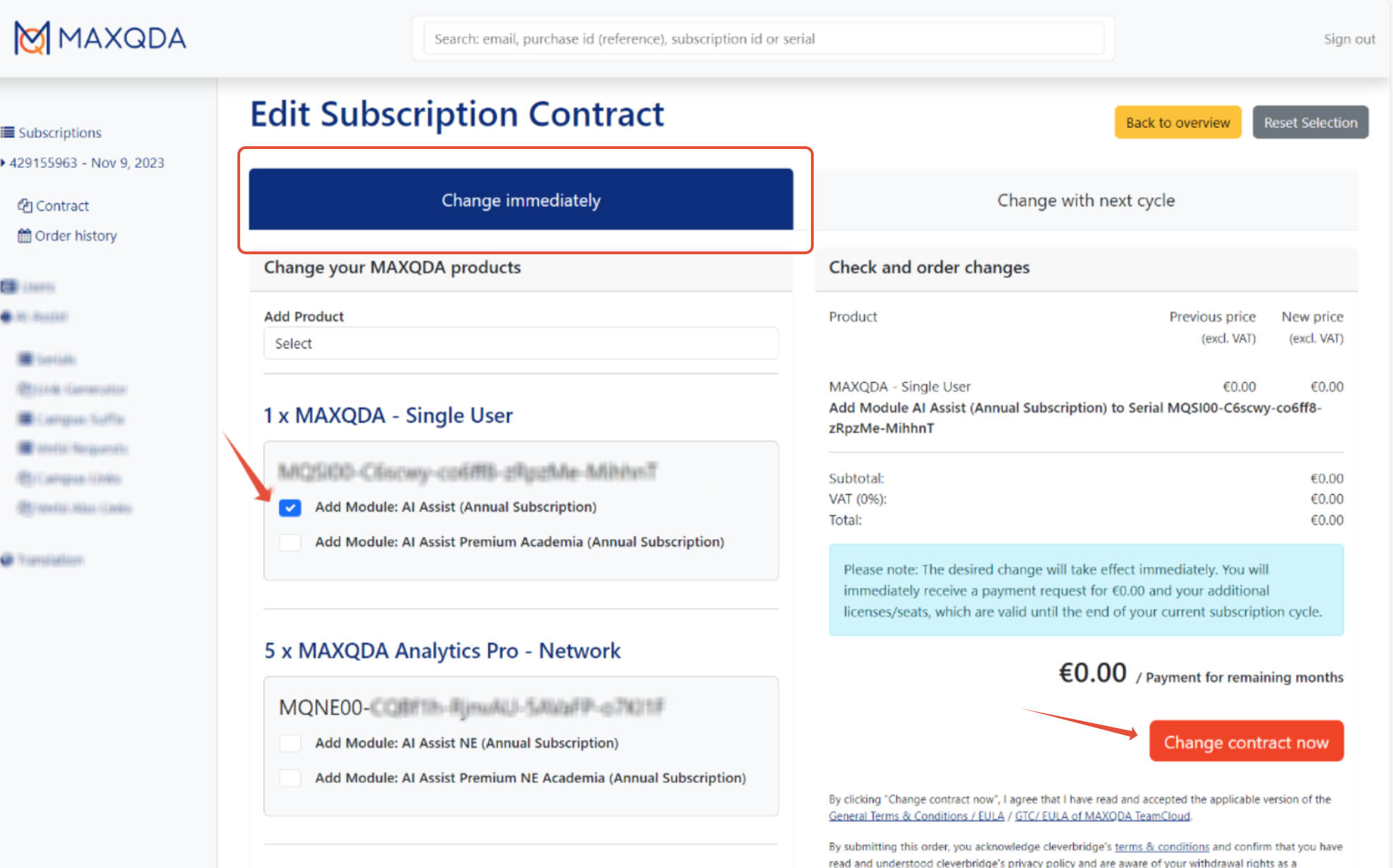 - Klicken Sie dann auf "Change contract now"