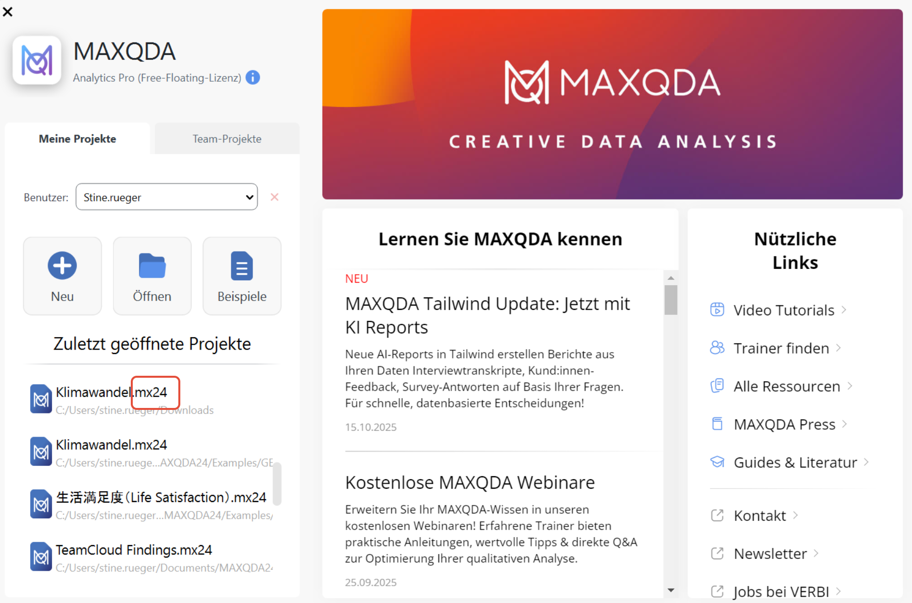 Wenn Sie von MAXQDA 24 zu MAXQDA 26 upgegradet haben, sehen Sie Ihre bestehenden Projekte direkt im Startbildschirm.