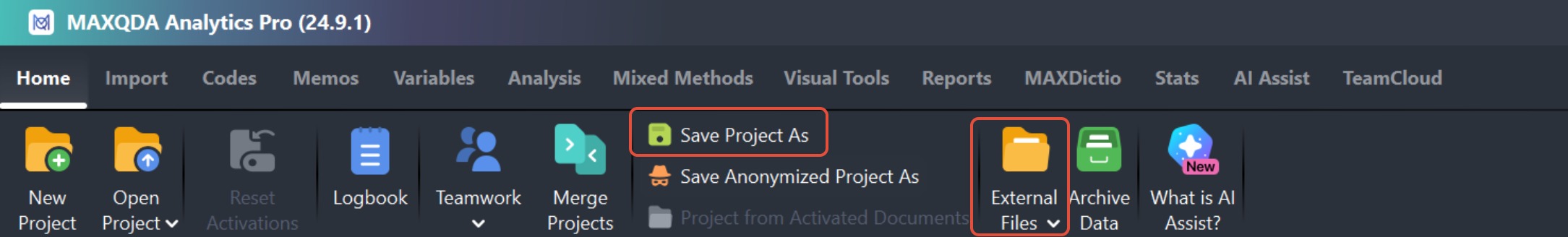 - Das Projekt wird nun als MAXQDA Projekt mit der Endung mqda gespeichert. Dateien die eine gewisse Größe haben werden automatisch im Ordner MAXQDA_Externals gespeichert.