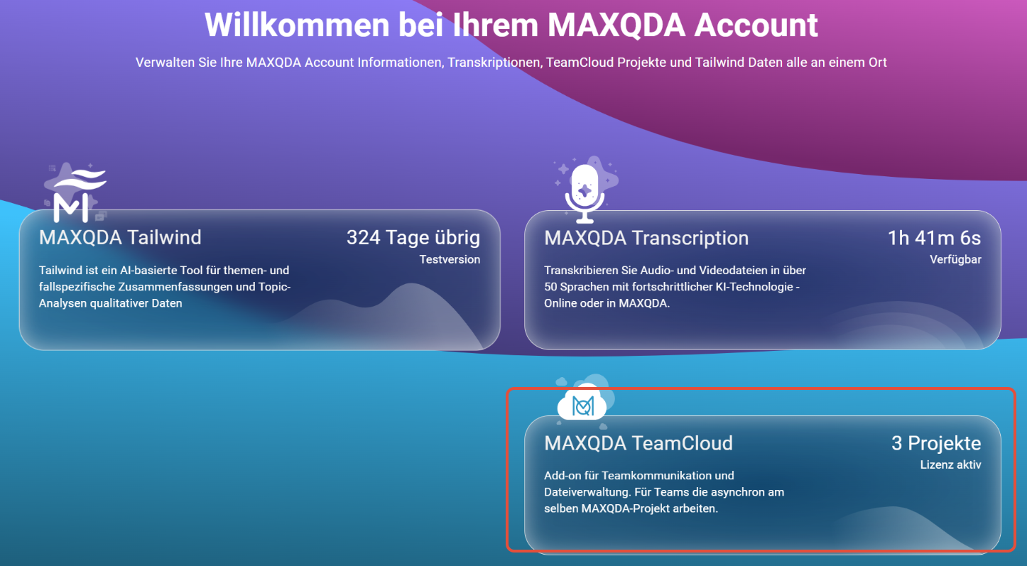 Registrieren Sie sich oder loggen Sie sich in der TeamCloud Web-App mit Ihrem MAXQDA-Account ein.