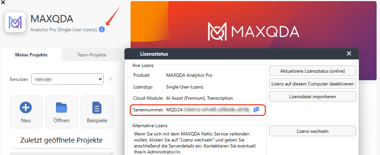 Wenn Sie MAXQDA verwenden, können Sie Ihre Seriennummer im Lizenzstatus des Programms einsehen.