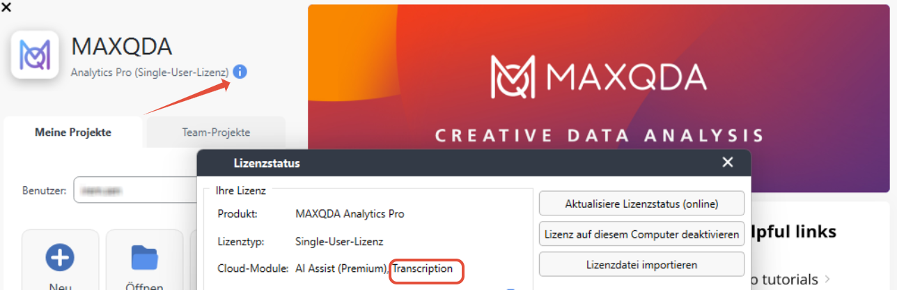 Um zu erkennen, ob das Transcription Feature in Ihrer Lizenz aktiviert ist, öffnen Sie bitte den Lizenzstatus.