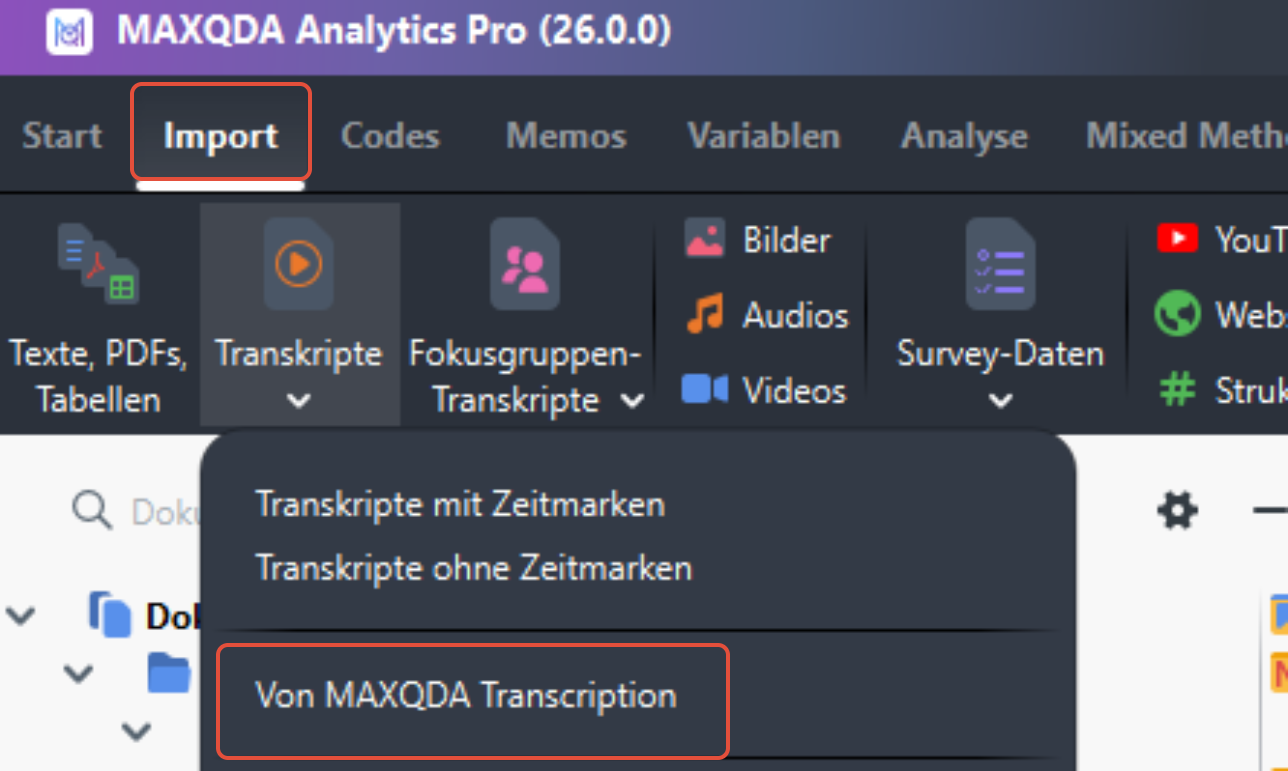 Sollte hier nicht Transcription angezeigt werden, dann steht die Funktion nicht in MAXQDA zur Verfügung.