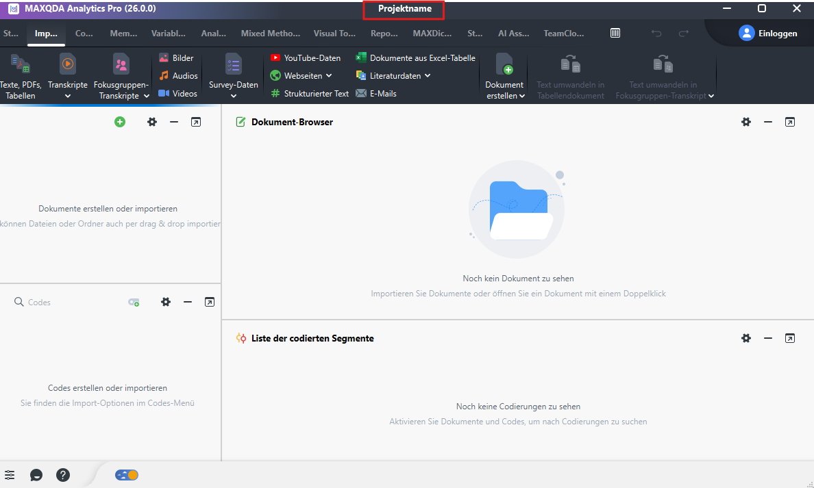 1) Klicken Sie auf dem MAXQDA Startfenster (erste Seite, die sich öffnet, wenn Sie die App starten) auf Neues Projekt: