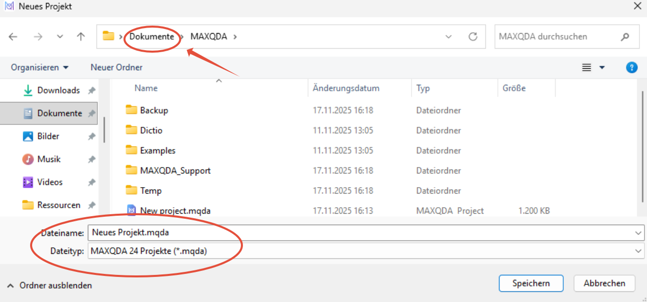 2) Speichern Sie Ihr neues, leeres Projekt als .mqda Datei lokal in einem Ordner auf Ihrem Rechner: