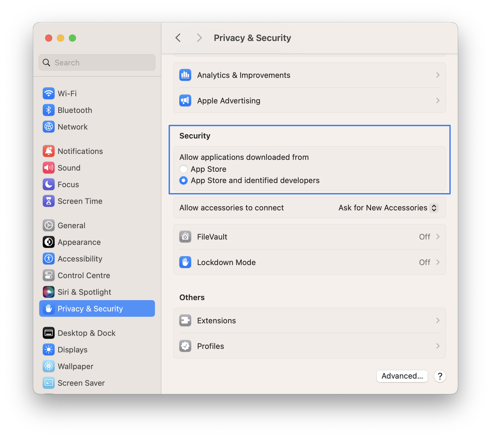 Open System Preferences > Security & Privacy and scroll down to Security.