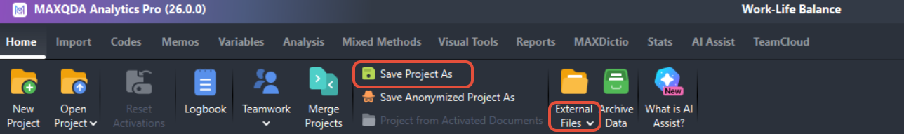 - El proyecto ahora se guarda como un proyecto de MAXQDA con la extensión .mqda. Los archivos de cierto tamaño se guardan automáticamente en la carpeta MAXQDA_Externals.