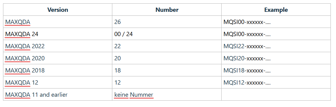 El número de serie contiene información sobre la versión de MAXQDA, la duración de la validez, el tipo de licencia y el tipo de producto.