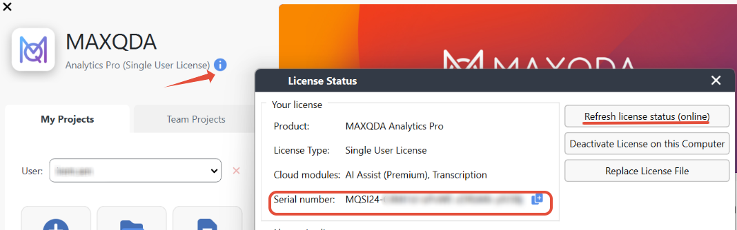 Puedes encontrar tu número de serie en MAXQDA en la página de inicio haciendo clic en la i azul o en el proyecto MAXQDA 24 en la esquina inferior izquierda en el signo de interrogación y luego en Estado de la licencia.
