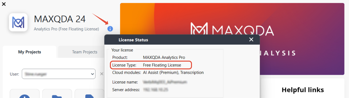 Si ya esta usando MAXQDA, podrá encontrar el número de serie en el estado de la licencia de MAXQDA. Cuando inicie MAXQDA, simplemente haga clic en la letra azul (i).