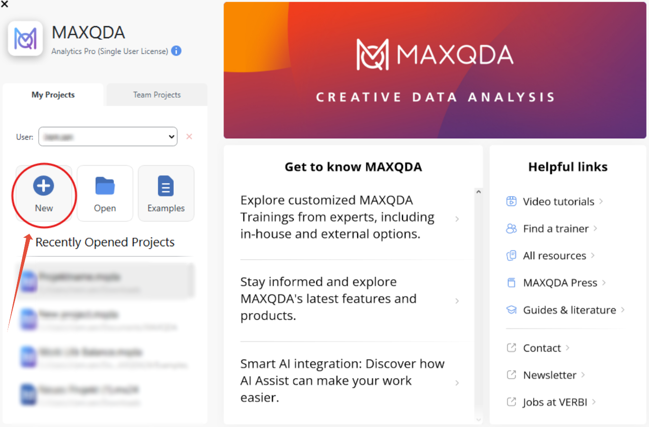 - Haz clic en Nuevo proyecto en la ventana de inicio de MAXQDA (la primera página que se abre cuando inicias la aplicación):